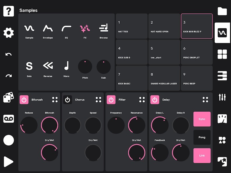 - 4 effects per track: Delay, Filter, Chorus, Bitcrush