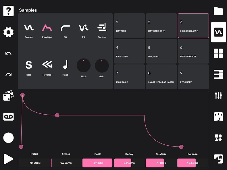 - Adjustable pitch, volume, playback direction, sample start and stop points