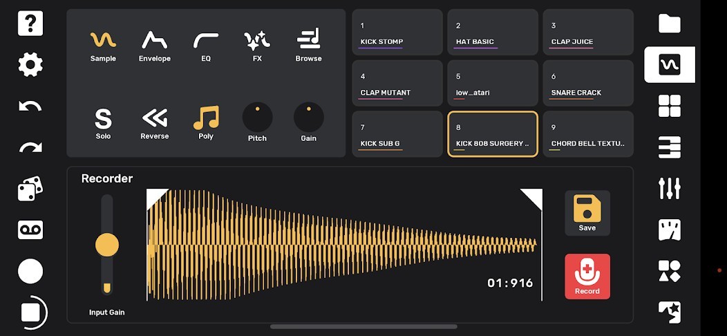 Import your own sounds, or record sounds directly with your device's microphone. As soon as you record a sound it’s available to be played on drum pads as well as being mapped across a keyboard. Sounds can be subtly shaped or entirely transformed using the built-in effects and easy-to-use editing tools.You can record a quantized or unquantized performance on the pads or keyboard. There is also a full piano roll where you can enter and edit notes and velocities.