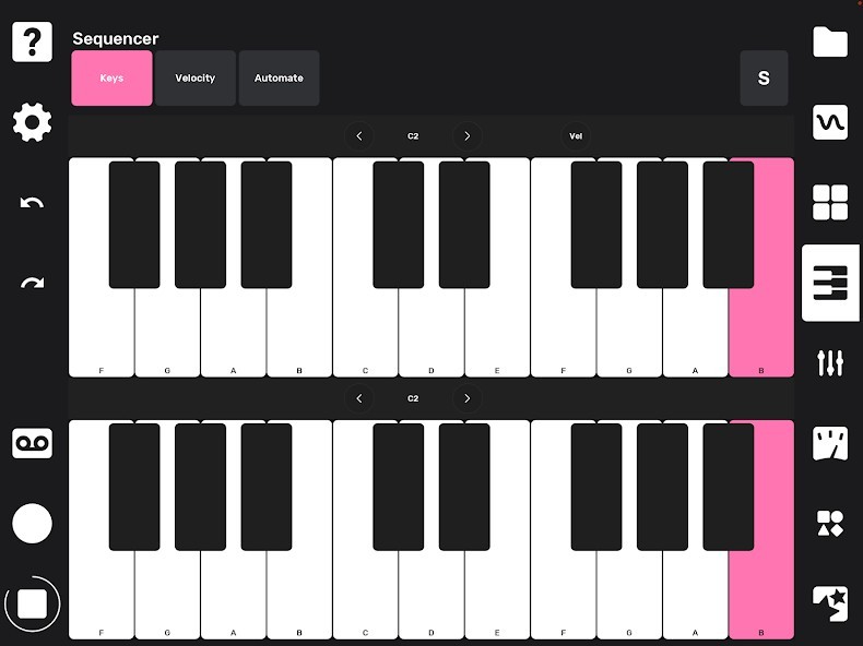 - Full piano roll with 10 octaves, note velocity, editing tools