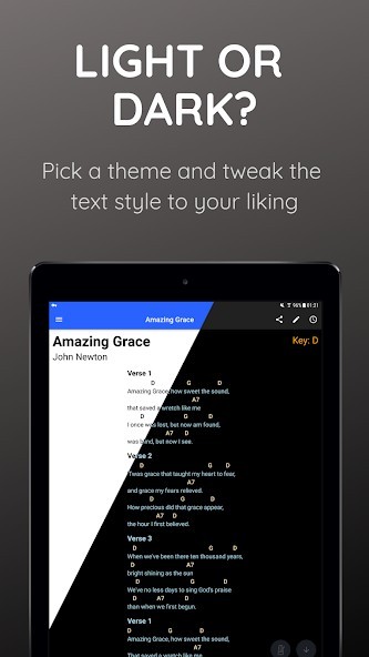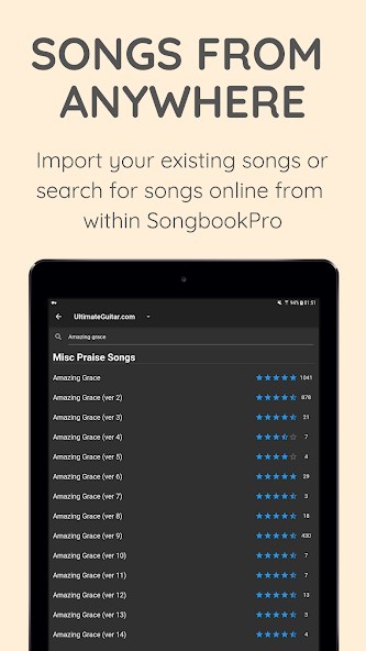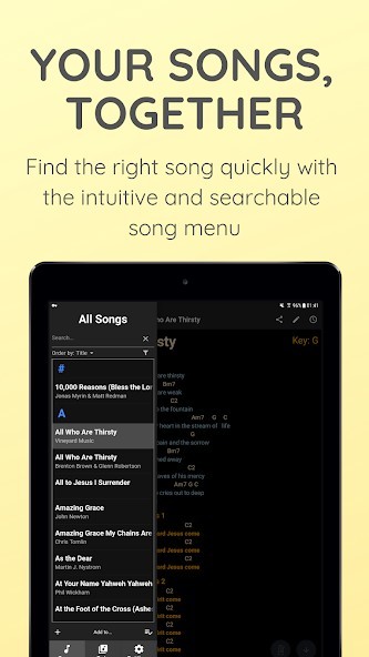 - Import songs in ChordPro or onsong formats, as PDF documents or directly from UltimateGuitar.com and WorshipTogether.com